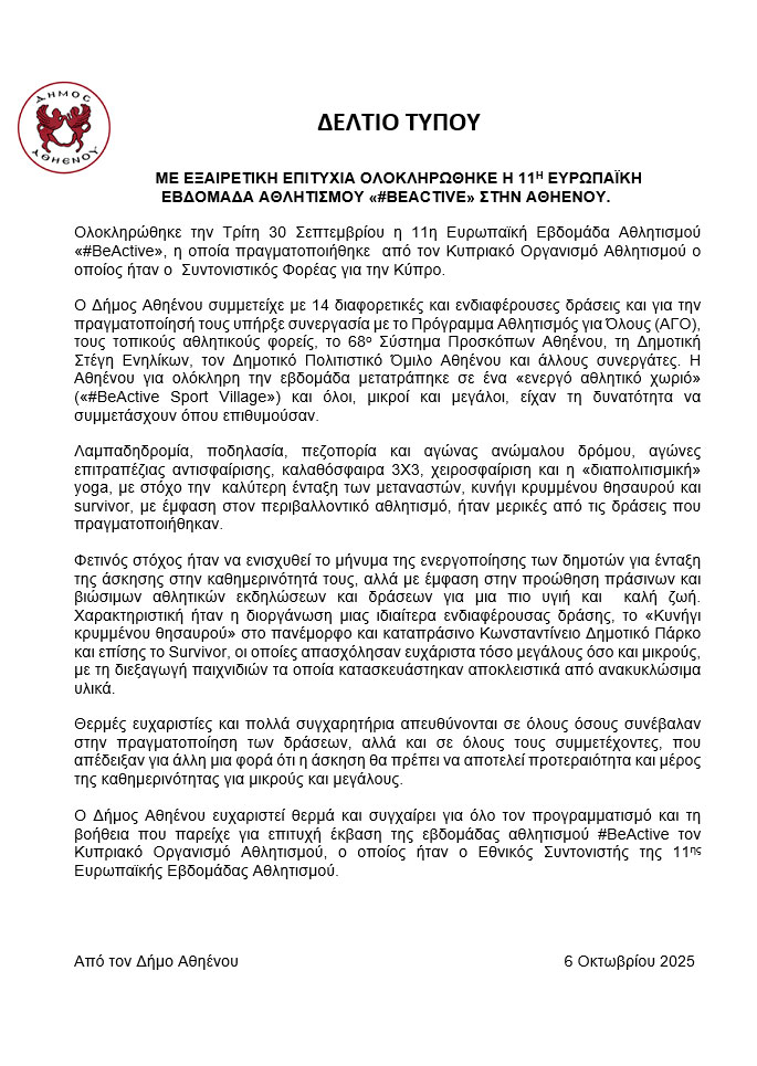 11Η ΕΥΡΩΠΑΪΚΗ ΕΒΔΟΜΑΔΑ ΑΘΛΗΤΙΣΜΟΥ «#BEACTIVE» ΣΤΗΝ ΑΘΗΕΝΟΥ