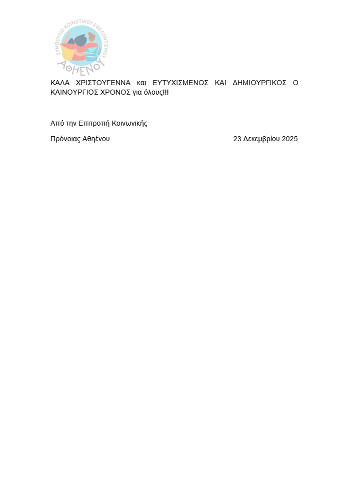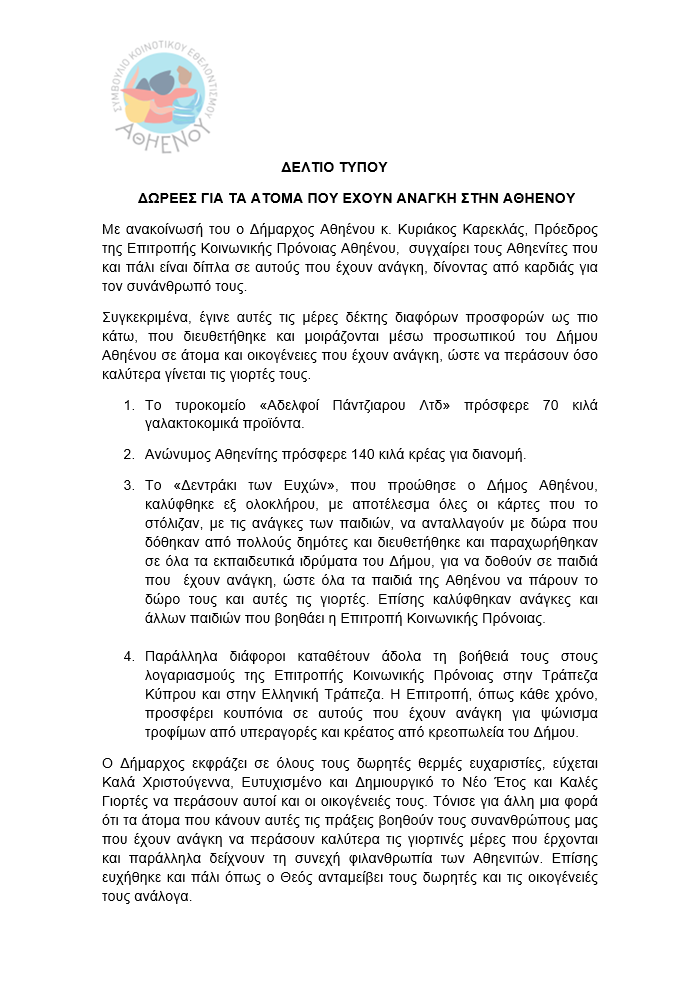 ΔΕΛΤΙΟ ΤΥΠΟΥ – ΔΩΡΕΕΣ ΓΙΑ ΤΑ ΑΤΟΜΑ ΠΟΥ ΕΧΟΥΝ ΑΝΑΓΚΗ ΣΤΗΝ ΑΘΗΕΝΟΥ