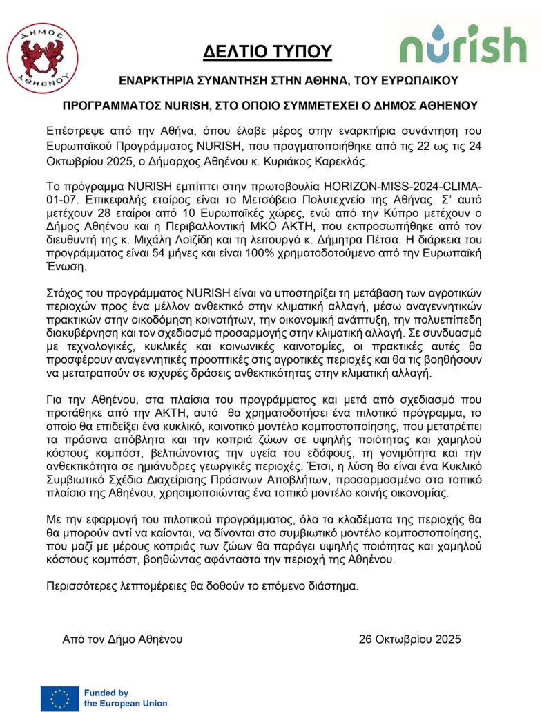 ΔΕΛΤΙΟ ΤΥΠΟΥ-ΕΝΑΡΚΤΗΡΙΑ ΣΥΝΑΝΤΗΣΗ ΤΟΥ ΕΥΡΩΠΑΙΚΟΥ ΠΡΟΓΡΑΜΜΑΤΟΣ NURISH