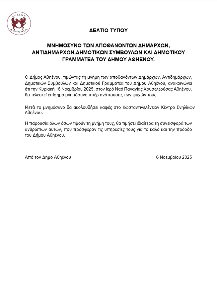 ΔΕΛΤΙΟ ΤΥΠΟΥ: ΜΝΗΜΟΣΥΝΟ ΤΩΝ ΑΠΟΘΑΝΟΝΤΩΝ ΔΗΜΑΡΧΩΝ, ΑΝΤΙΔΗΜΑΡΧΩΝ,ΔΗΜΟΤΙΚΩΝ ΣΥΜΒΟΥΛΩΝ ΚΑΙ ΔΗΜΟΤΙΚΟΥ ΓΡΑΜΜΑΤΕΑ ΤΟΥ ΔΗΜΟΥ ΑΘΗΕΝΟΥ