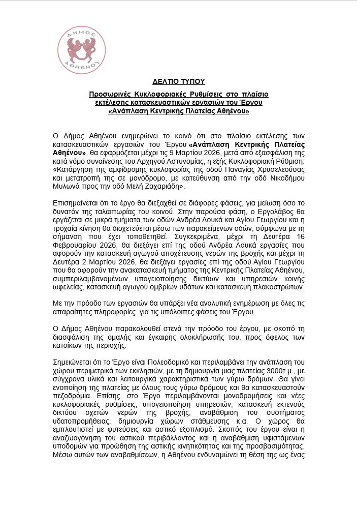 ΔΕΛΤΙΟ ΤΥΠΟΥ-Προσωρινές Κυκλοφοριακές Ρυθμίσεις στο πλαίσιο εκτέλεσης κατασκευαστικών εργασιών του Έργου «Ανάπλαση Κεντρικής Πλατείας Αθηένου