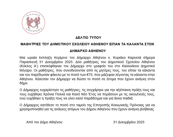 ΜΑΘΗΤΡΙΕΣ ΤΟΥ ΔΗΜΟΤΙΚΟΥ ΣΧΟΛΕΙΟΥ ΑΘΗΕΝΟΥ ΕΙΠΑΝ ΤΑ ΚΑΛΑΝΤΑ ΣΤΟΝ ΔΗΜΑΡΧΟ ΑΘΗΕΝΟΥ