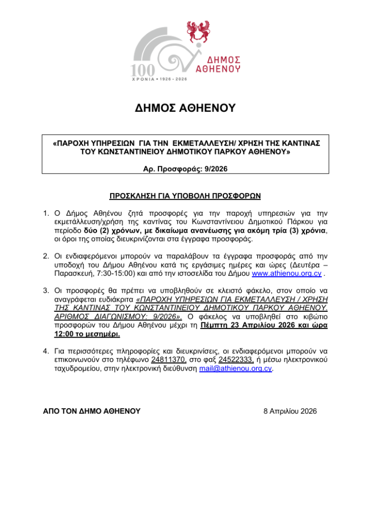 ΠΑΡΟΧΗ ΥΠΗΡΕΣΙΩΝ ΓΙΑ ΤΗΝ ΕΚΜΕΤΑΛΛΕΥΣΗ/ ΧΡΗΣΗ ΤΗΣ ΚΑΝΤΙΝΑΣ ΤΟΥ ΚΩΝΣΤΑΝΤΙΝΕΙΟΥ ΔΗΜΟΤΙΚΟΥ ΠΑΡΚΟΥ ΑΘΗΕΝΟΥ